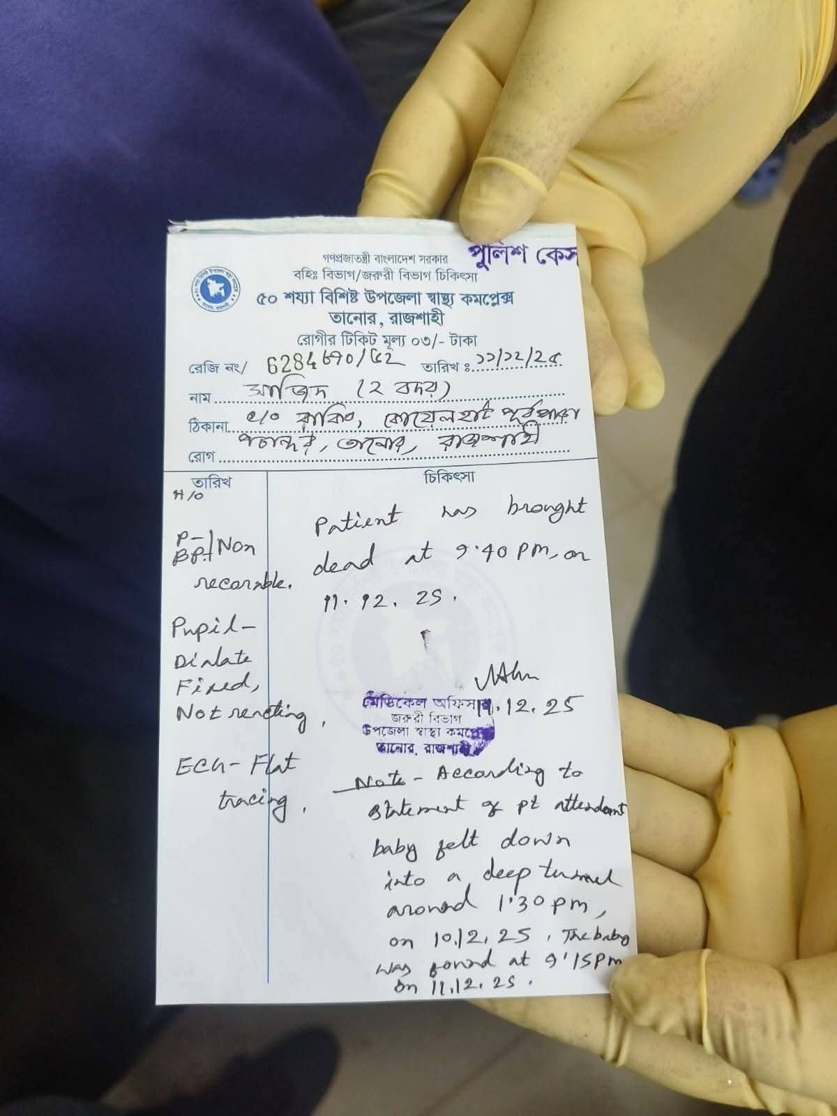 শিশু সাজিদের নানা আইয়ূব আলী বলেন, ‘উদ্ধারের সময় সাজিদ বেঁচে ছিল। ফায়ার সার্ভিসের কর্মকর্তারা বলছিলেন সে বেঁচে আছে। আমি নিজে দেখেছি সে বেঁচে ছিল। কিন্তু হাসপাতালে আসার পর মারা গেল। মরদেহ তার বাড়ি তানোর কুড়িরহাট পূর্বপাড়া নেওয়া হয়েছে।’