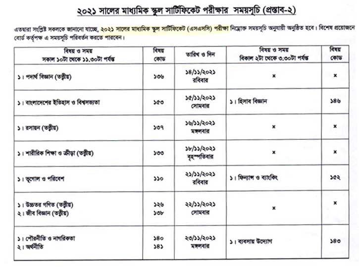 প্রকাশিত সময়সূচি অনুযায়ী, চলতি বছরের এসএসসি পরীক্ষা শুরু হবে ১৪ নভেম্বর এবং শেষ হবে ২৩ নভেম্বর। যথাযথ স্বাস্থ্যবিধি মেনেই পরীক্ষা অনুষ্ঠিত হবে। প্রতিটি পরীক্ষার সময় থাকবে দেড় ঘণ্টা। এ জন্য বহুনির্বাচনী ও তত্ত্বীয় পরীক্ষার মধ্যে কোনো বিরতি থাকবে না।