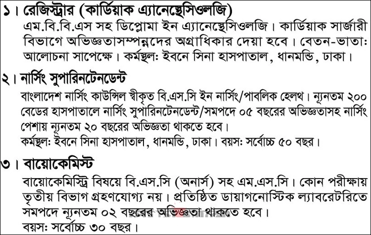 নিয়োগ বিজ্ঞপ্তি প্রকাশ করেছে দি ইবনে সিনা ট্রাস্ট। আগ্রহীরা আগামী ২৮ সেপ্টেম্বর পর্যন্ত আবেদন করতে পারবেন।