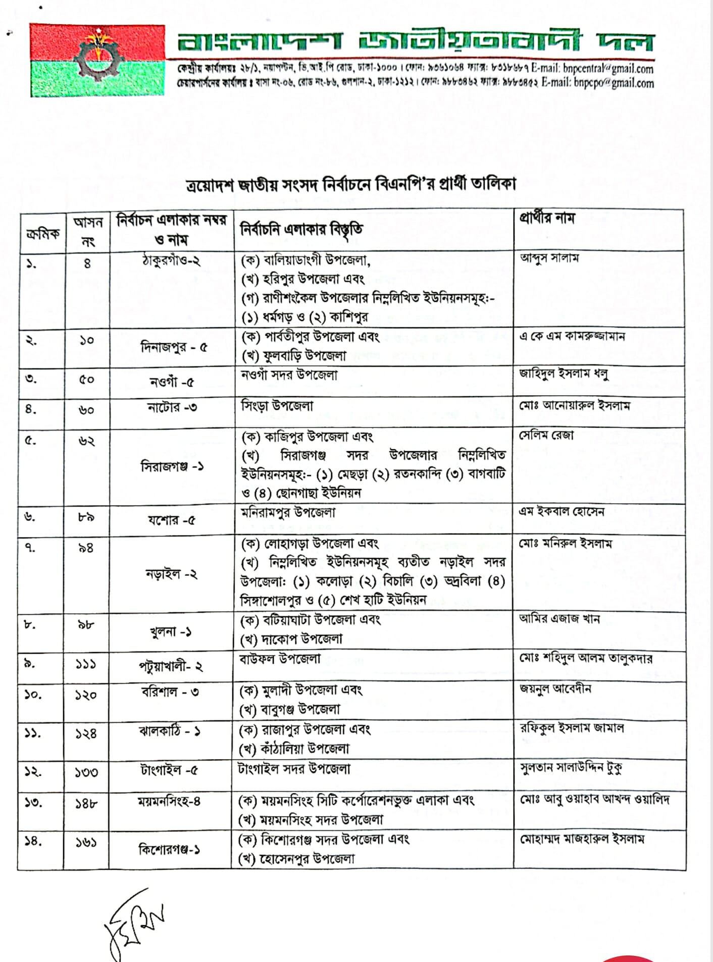 সিরাজগঞ্জ-১ আসনে সেলিম রেজা, যশোর-৫ আসনে এম ইকবাল হোসেন, নড়াইল-২ আসনে মনিরুল ইসলাম, খুলনা-১ আসনে আমির এজাজ খান, পটুয়াখালী-২ আসনে মোহাম্মদ শহিদুল আলম তালুকদার, বরিশাল-৩ আসনে জয়নাল আবেদীন ও ঝালকাঠি-১ আসনে রফিকুল ইসলাম জামাল বিএনপির হয়ে প্রতিদ্বন্দ্বিতা করবেন।