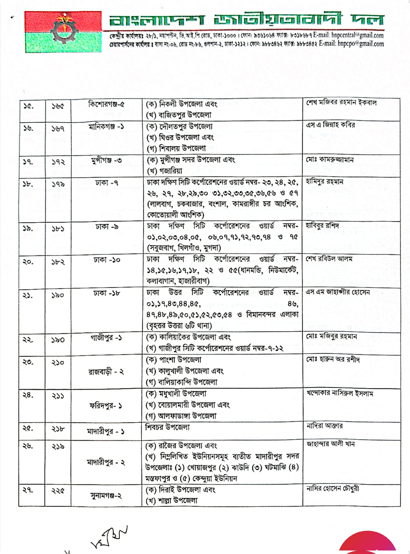 ঢাকা-৭ আসনে হামিদুর রহমান, ঢাকা-৯ আসনে হাবিবুর রশিদ, ঢাকা-১০ আসনে শেখ রবিউল আলম, ঢাকা-১৮ আসনে এস এম জাহাঙ্গীর হোসেন, গাজীপুর-১ আসনে মো. মুজিবুর রহমান, রাজবাড়ী-২ আসনে মো. হারুনুর রশিদ, ফরিদপুর-১ আসনে খন্দোকার নাসিরুল ইসলাম, মাদারীপুর-১ আসনে নাদিয়া আক্তার ও মাদারীপুর-২ আসনে জাহান্দার আলী খান বিএনপির হয়ে প্রতিদ্বন্দ্বিতা করবেন।