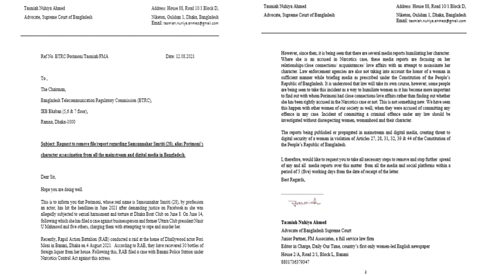 ডিজিটাল মিডিয়ায় পরীমনির ব্যক্তিগত ও অপ্রাসঙ্গিক ছবি, ভিডিও ও তথ্য নিয়ে অপপ্রচার বন্ধের আহ্বান জানিয়েছেন সুপ্রিম কোর্টের আইনজীবী এডভোকেট তাসমিয়া নুহিয়া আহমেদ। সব প্ল্যাটফর্ম থেকে পরীমনির মানহানিকর ছবি-ভিডিও ও প্রতিবেদন সরিয়ে ফেলতে বিটিআরসির চেয়ারম্যানের কাছে আবেদন করেছেন তিনি।