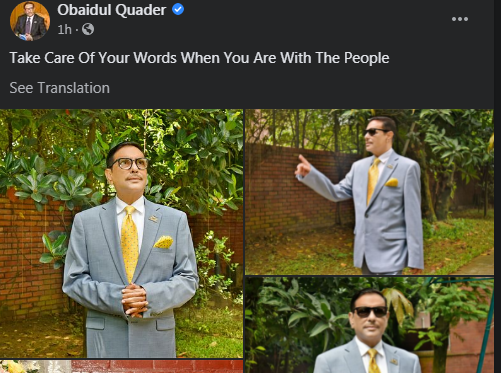 বৃহস্পতিবার (১৬ সেপ্টেম্বর) সকালে নিজের ভেরিফায়েড ফেসবুক অ্যাকাউন্টটিতে মন্ত্রী স্ট্যাটাসে লিখেন, ‘Take Care Of Your Words When You Are With The People’ বা ‘জনসম্মুখে কথা বলার সময় সতর্ক থাকবেন’। ইতিমধ্যে এই পোস্টে ৬ হাজারের বেশি প্রতিক্রিয়া ও শতাধিক মানুষ মন্তব্য করেছেন।