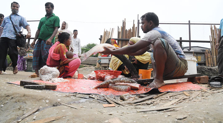 ‘মাছে ভাতে বাঙালি।’ মাছ না খেয়ে কি আর পারা যায়। এভাবে প্রতিদিন ক্রেতাদের মাছ কাটায় ব্যস্ত থাকেন তারা। স্থান : কারওয়ান বাজার।