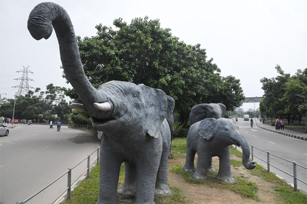 রাজধানীর বিনোদকেন্দ্র হাতিরঝিল এলাকার সম্মুখপথ। পথচারীদের স্বাগত জানাচ্ছে প্রতীকী এ হাতিগুলো। ছবি : কামরুল ইসলাম, ফটো সাংবাদিক, সংবাদ প্রকাশ।