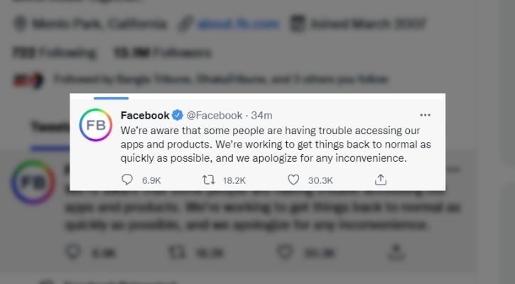 বিশ্বের বিভিন্ন প্রান্তে, সোমবার (৪ অক্টোবর) রাতে, হঠাৎ করেই ফেসবুক, হোয়াটসঅ্যাপ ও ইন্সটাগ্রাম ব্যবহারকারীরা সমস্যার মুখে পড়েন। ইন্টারনেট সংযোগ থাকা সত্ত্বেও কেউ এসময় জনপ্রিয় সামাজিক যোগাযোগের মাধ্যমগুলোতে ঢুকে কাজ করতে পারছিলেন না। খবর এনডিটিভির।